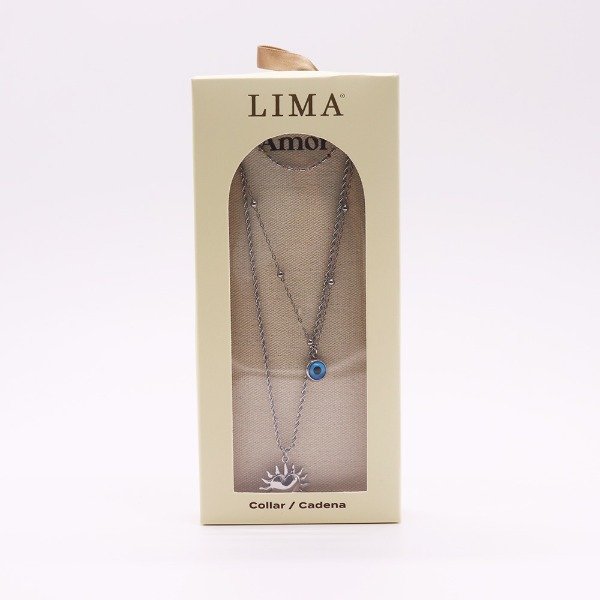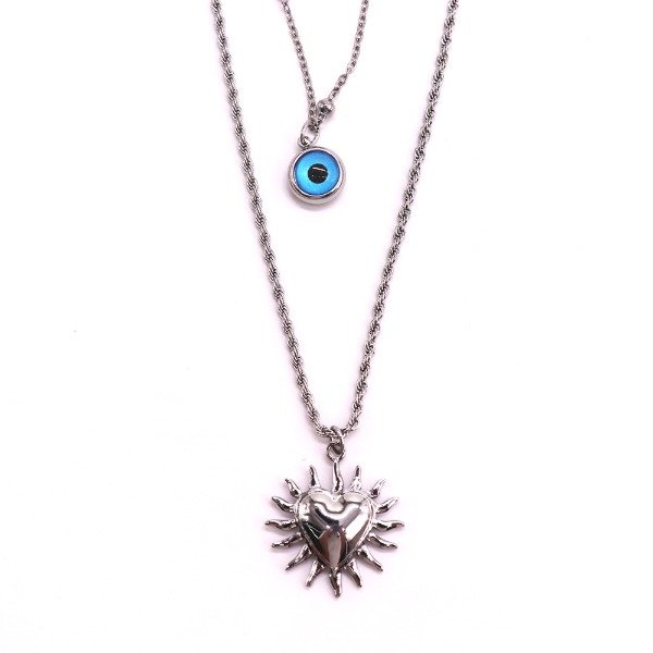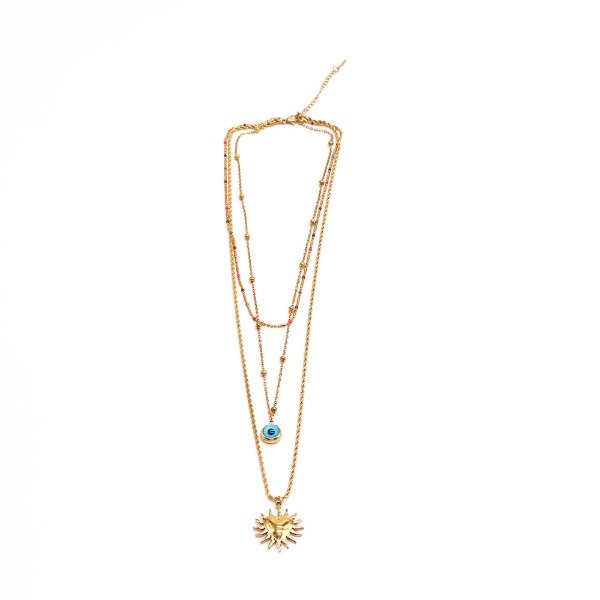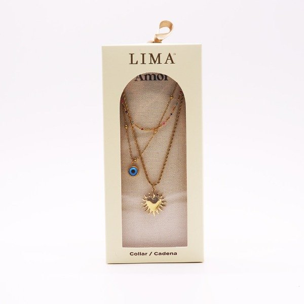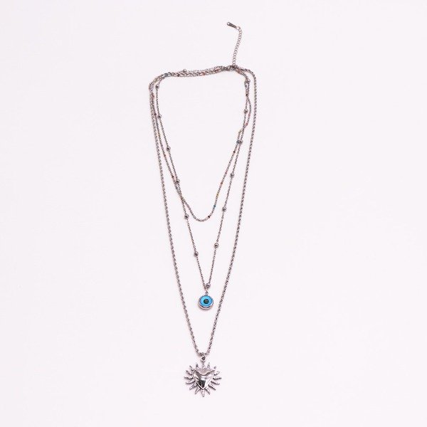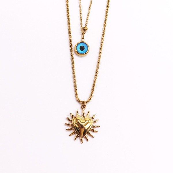 De estilo layer en tres niveles, este collar combina cadenas de distintos eslabones y dijes colgantes para un look con carácter y estilo. El dije principal es un corazón estilo mexicano, acompañado de un pequeño ojo en piedra, que aporta un toque místico y original. Incluye tope de seguridad para ajustarlo fácilmente al cuello.