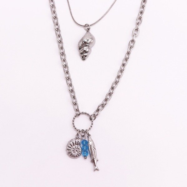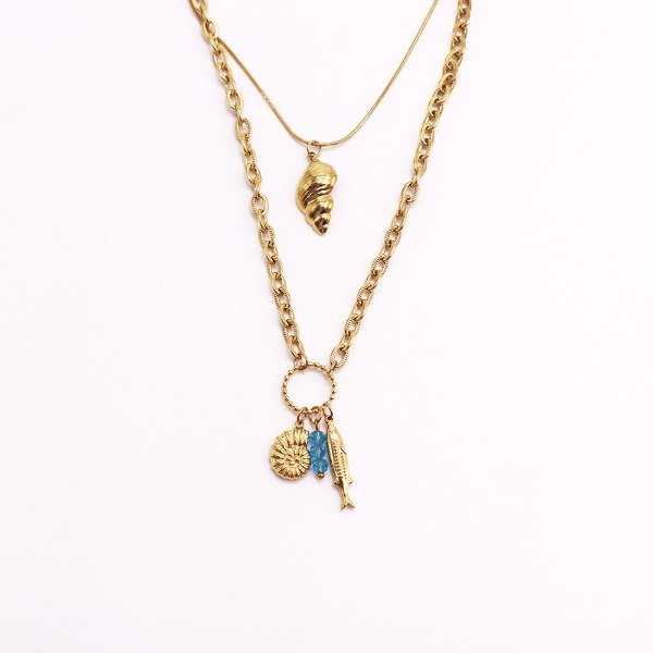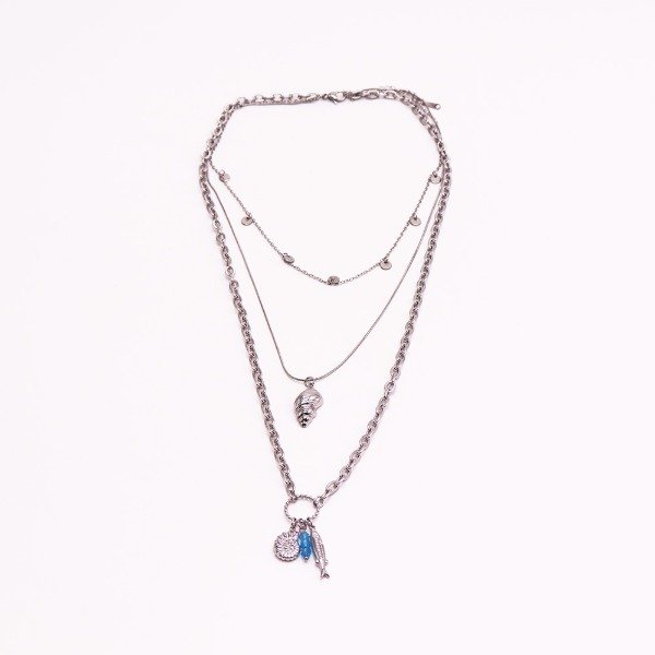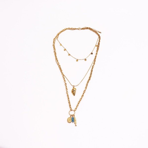 Inspirado en el mar, este collar le aporta un aire veraniego y fresco a tu look. De estilo layer, cuenta con tres largos de cadenas de distintos espesores y dijes colgantes que suman movimiento y personalidad. Incluye tope de seguridad para ajustarlo a la medida de tu cuello. Ideal para complementar desde un outfit relajado hasta uno más canchero.