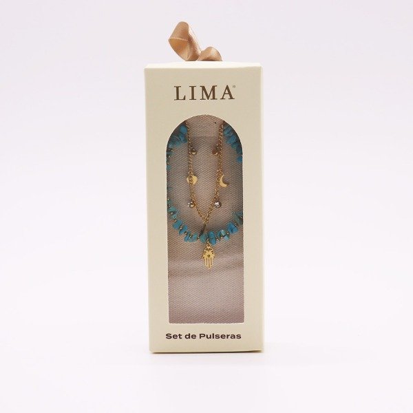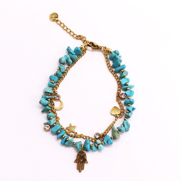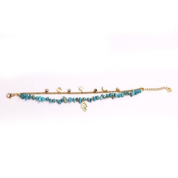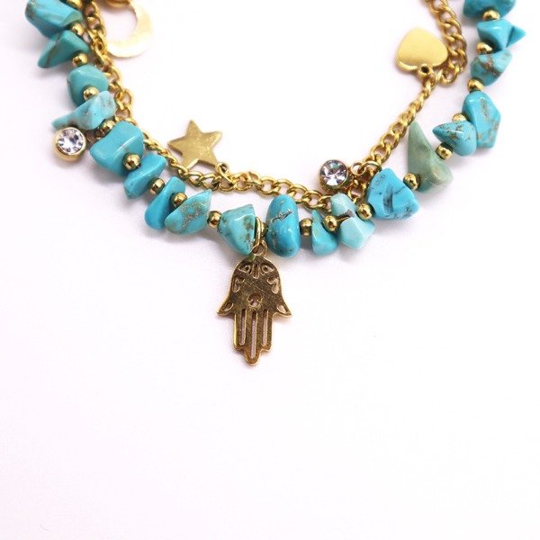 Pulsera Doble con Dijes y Piedras Pulsera doble de cadena de metal con baño dorado, ideal para sumar una onda veraniega y fresca a tu look. Incluye dijes colgantes y piedras fantasía en tonos turquesa que le aportan color y movimiento. Cuenta con tope de segiridad para ajustarla fácilmente a la medida de tu muñeca, logrando un calce cómodo y seguro.