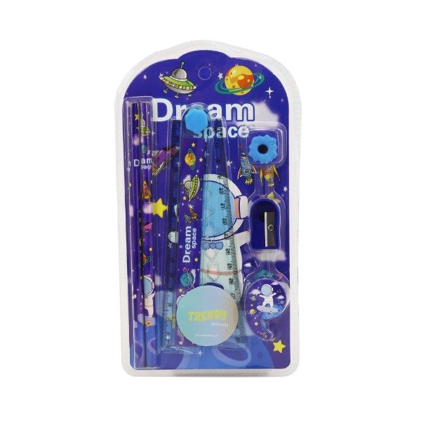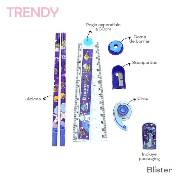 Info: Blíster Lápices, regla expandible a 30cm, sacapuntas, goma de borrar, cinta, inc packaging