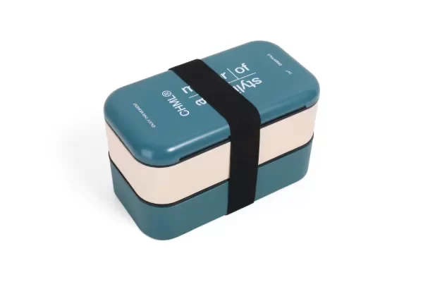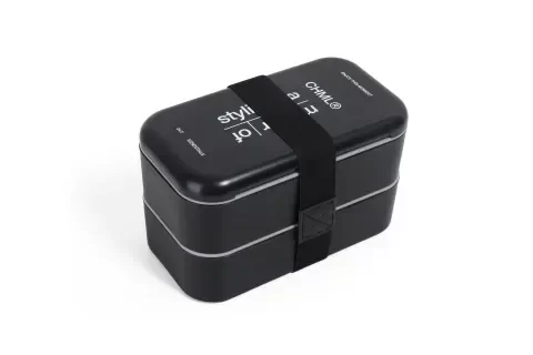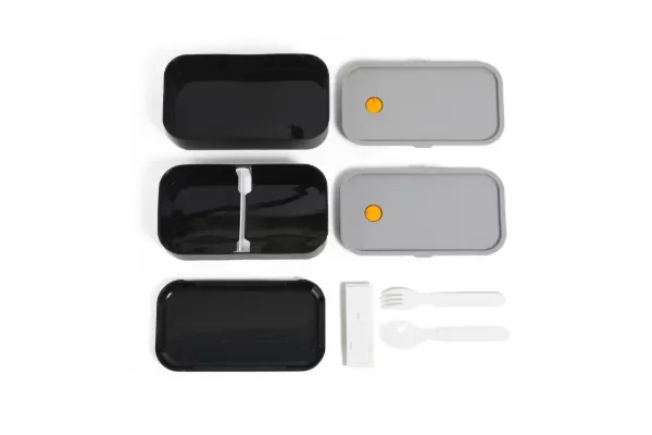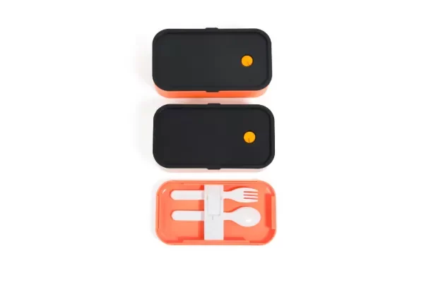 "Lunchbox doble compartimento con cubiertos integrados. Material: Plástico PP de alta resistencia, libre de BPA. Incluye: 2 recipientes independientes con tapa 1 set de cubiertos (tenedor y cuchara) 1 banda elástica para asegurar el cierre. Tapas con válvula de ventilación para uso con microondas. Diseño compacto, ideal para llevar comidas al trabajo. Apto para microondas (sin tapa). No apto lavavajillas. "