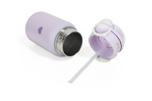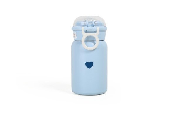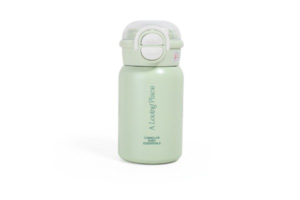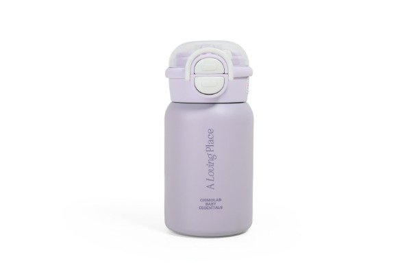 Botella térmica infantil con tapa de seguridad y boquilla retráctil. Interior: acero inoxidable 304. Tapa: PP con sistema de doble traba y cubierta transparente. Sistema de apertura por dpble botón con traba de seguridad para evitar derrames. Fácil de transportar. No apta para microondas ni lavavajillas.
