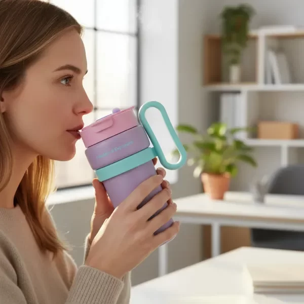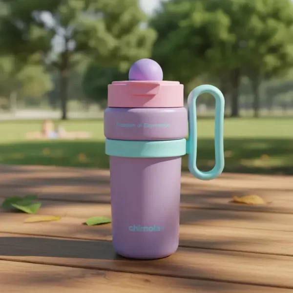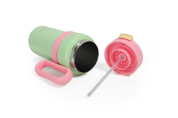 Vaso térmico con manija lateral y tapa abatible. Cuerpo: plástico PP resistente, libre de BPA. Tapa: PP con cierre abatible y traba de seguridad.Boquilla interior de silicona. Incluye manija lateral ergonómica para un agarre cómodo. Ideal para bebidas frías o calientes (hasta 60 °C). No apto para microondas ni lavavajillas.