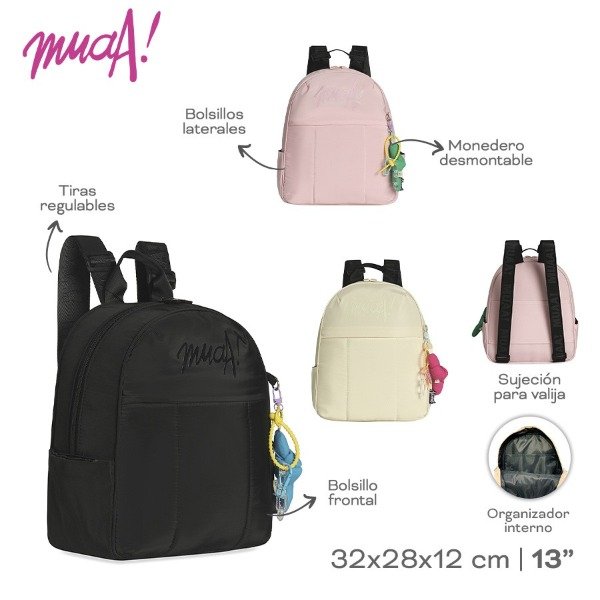Mochila Muaa 32cm 28cm 12cm Nylon 13p Bol front, lat, tir reg, monedero desmt, org int